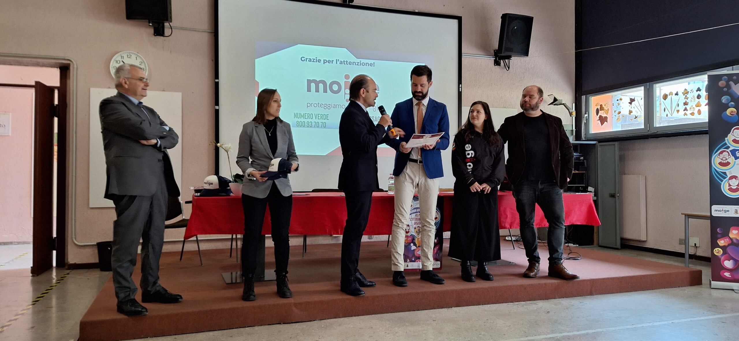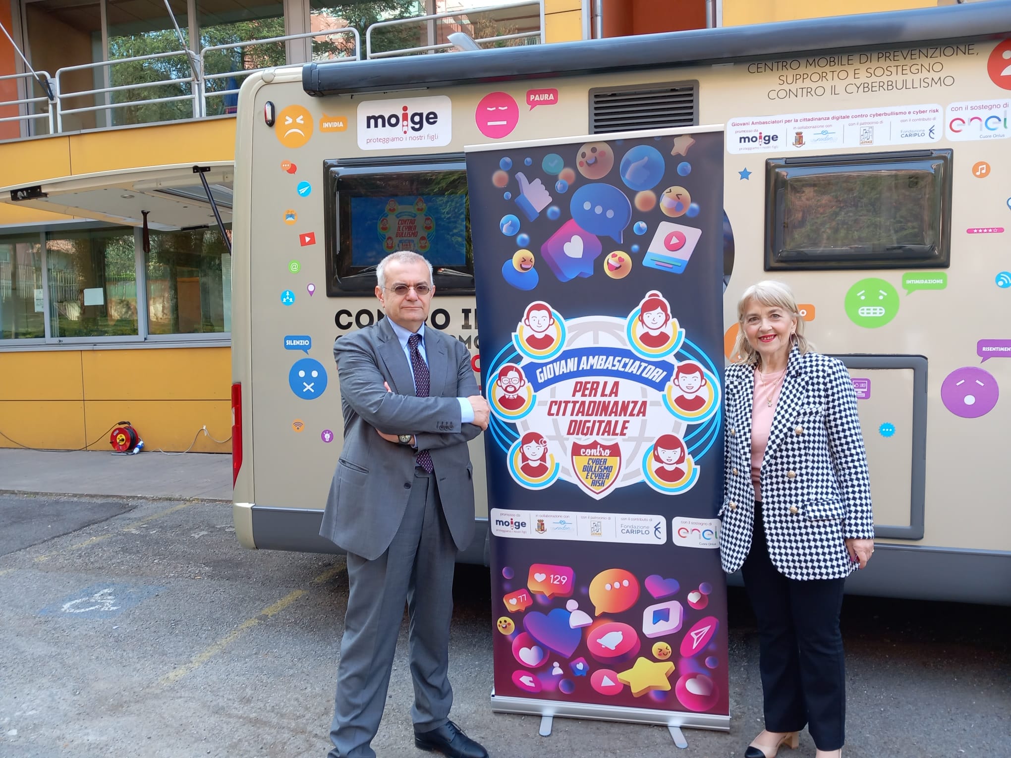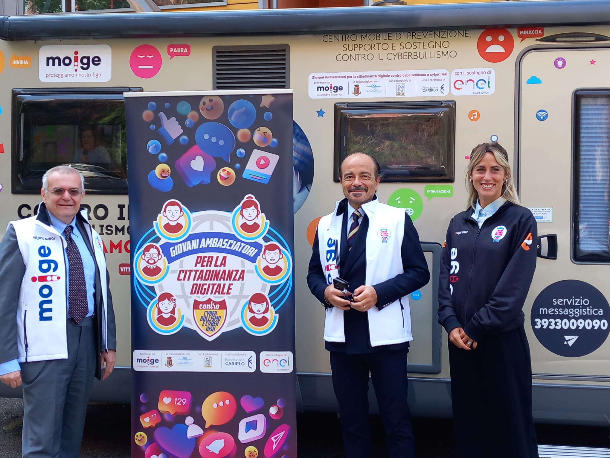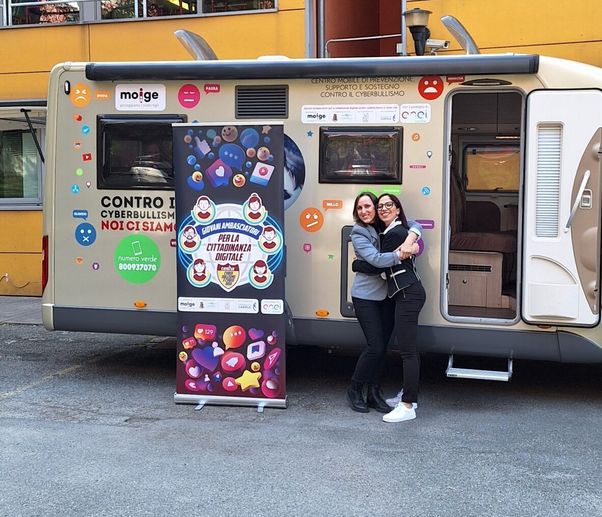 9 Maggio 2023 Lo scorso venerdì si è tenuta una tappa evento del Tour in Lombardia del progetto “Giovani Ambasciatori”: abbiamo realizzato un entusiasmante evento di premiazione dei Giovani Ambasciatori dell’IC Como Rebbio. Ospiti istituzionali e momenti di riflessione hanno reso la giornata di prevenzione realizzata dal Moige ancora più importante. Ad inaugurare la giornata di formazione Daniela De Fazio, Dirigente Scolastica IC Como Rebbio; il senatore Alessio Butti, Sottosegretario all’Innovazione presso la Presidenza del Consiglio; Stefano Locatelli, Vice Presidente Anci – Associazione Nazionale dei Comuni Italiani; Riccardo Bettiga, Garante per l’Infanzia e Adolescenza della Lombardia e Antonio Affinita, Direttore generale Moige. Le psicologhe Moige, a bordo del Centro Mobile, hanno raggiunto gli studenti, pronte e promuovere una formazione dedicata al tema dei cyber risk e spunti di riflessioni critica nei ragazzi, per permettere loro di usare il web e i social in modo responsabile. Premiazioni di Giovani Ambasciatori, docenti, genitori, interviste, chiacchiere e confronti, riflessioni, formazione partecipata e attiva… Tante attività svolte in vista di un solo obiettivo comune: la sicurezza in Rete dei nostri figli e la tutela della loro salute psicologica. La tappa a Como è stata svolta nell’ambito del progetto “Giovani Ambasciatori per la cittadinanza digitale contro cyberbullismo e cyber risk”, la nostra campagna di prevenzione al cyberbullismo, sostenuta da #EnelCuoreOnlus di Enel e da Fondazione Cariplo, che mira a promuovere tra i giovani consapevolezze in tema di cittadinanza digitale. Rivivi gli istanti più belli della tappa del tour a Como! Condividi l'articolo su