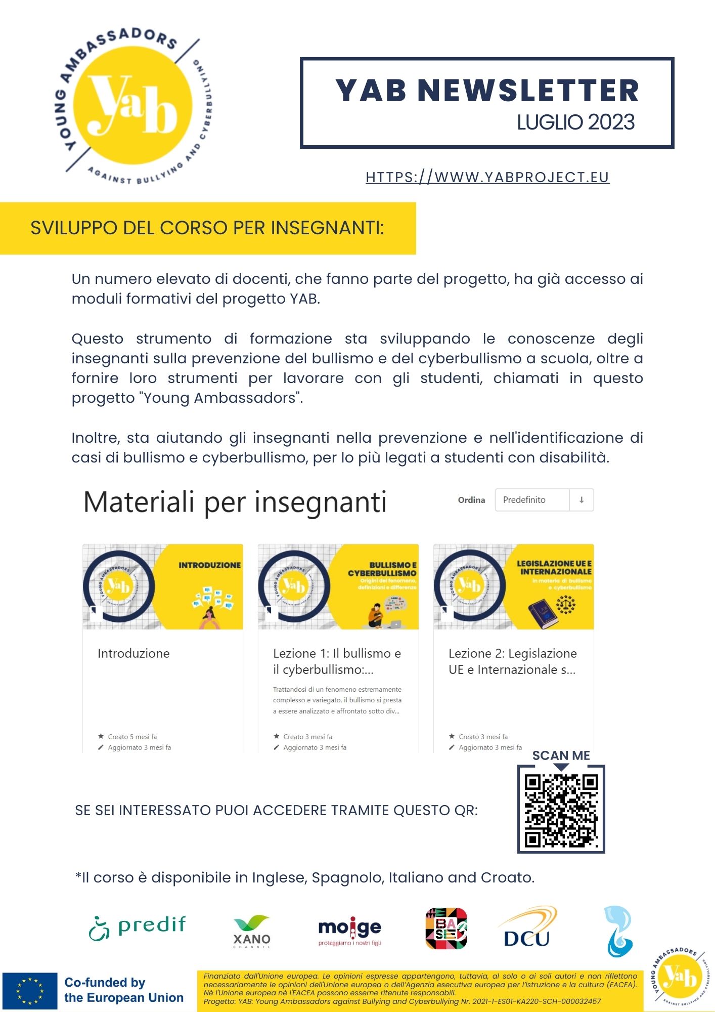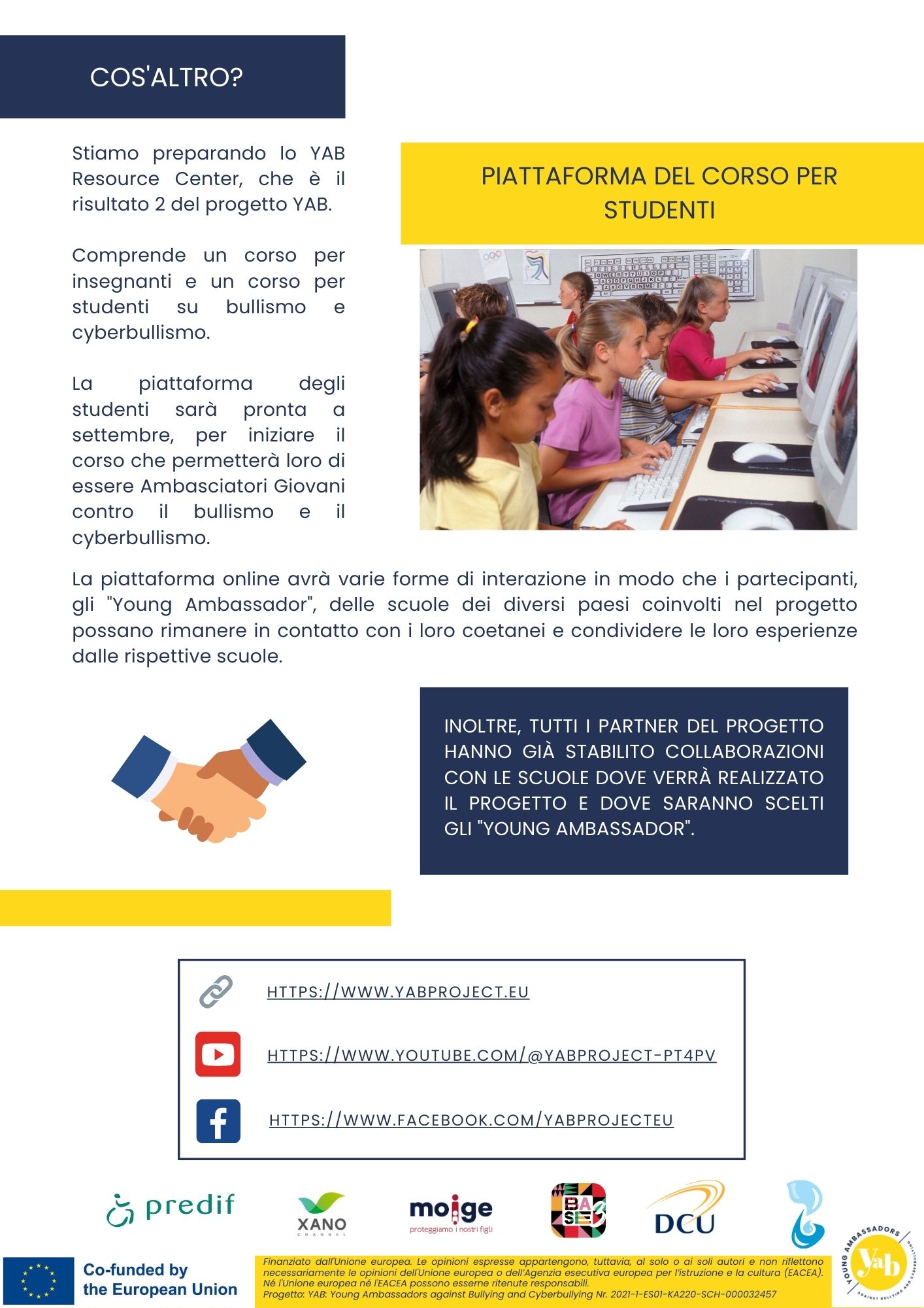 13 Luglio 2023 Online la terza Newsletter del progetto Erasmus+ YAB: Young Ambassadors against Bullying and Cyberbullying. Il progetto Europeo YAB permette di contrastare ed affrontare le problematiche legate al bullismo e al cyberbullismo, fornendo supporto e strumenti innovativi agli studenti con e senza disabilità, e agli insegnanti/educatori. La metodologia di riferimento è la “peer to peer” education: una strategia educativa fatta dai giovani per i giovani, che permette loro di potenziare risorse e competenze adeguate per offrire supporto ai pari ma anche scambiare informazioni su un tema importante come quello del cyberbullismo. Quasi in dirittura d’arrivo anche la piattaforma di formazione dedicata agli studenti: sarà disponibile da settembre 2023 ed aperta a tutti i Giovani Ambasciatori partecipanti. In Italia saranno creati 3 team e saranno loro a realizzare delle campagne antibullismo insieme alle squadre degli altri Paesi Europei. Scarica qui la newsletter di Gennaio 2023! 1st NEWSLETTER YAB Scarica qui la newsletter di Marzo 2023! 2nd NEWSLETTER YAB Scarica qui la newsletter di Luglio 2023! 3rd NEWSLETTER YAB Per conoscere maggiori dettagli e essere sempre aggiornato sui risultati del progetto visita il sito: www.yabproject.eu. Condividi l'articolo su